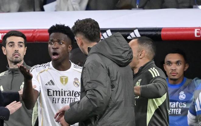 比赛末段,维尼修斯与巴塞罗那替补席爆发激烈冲突。他一度被队友和主教练哈维-阿隆索拉住,随后又冲向巴萨球员,并在场边与裁判争论。阿诺德坐在替补席上,全程目睹事态发展,他难以置信的神情引发球迷热议。